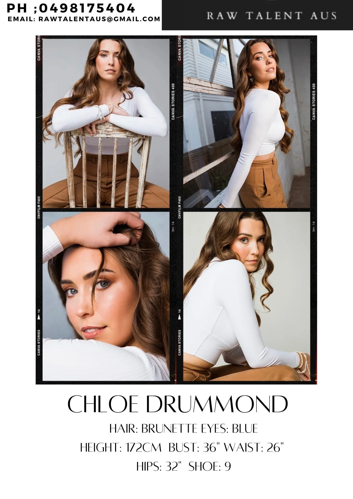 Chloe DHair: Brunette Eyes: Blue Skin: Light Height: 172cm Bust: 36” Waist: 26" Hips 32” Shoe: 9 Location: Gold Coast Slide 1 Slide 1 (current slide) Slide 2 Slide 2 (current slide) Slide 3 Slide 3 (current slide) Slide 4 Slide 4 (current slide) Slide 5 Slide 5 (current slide)